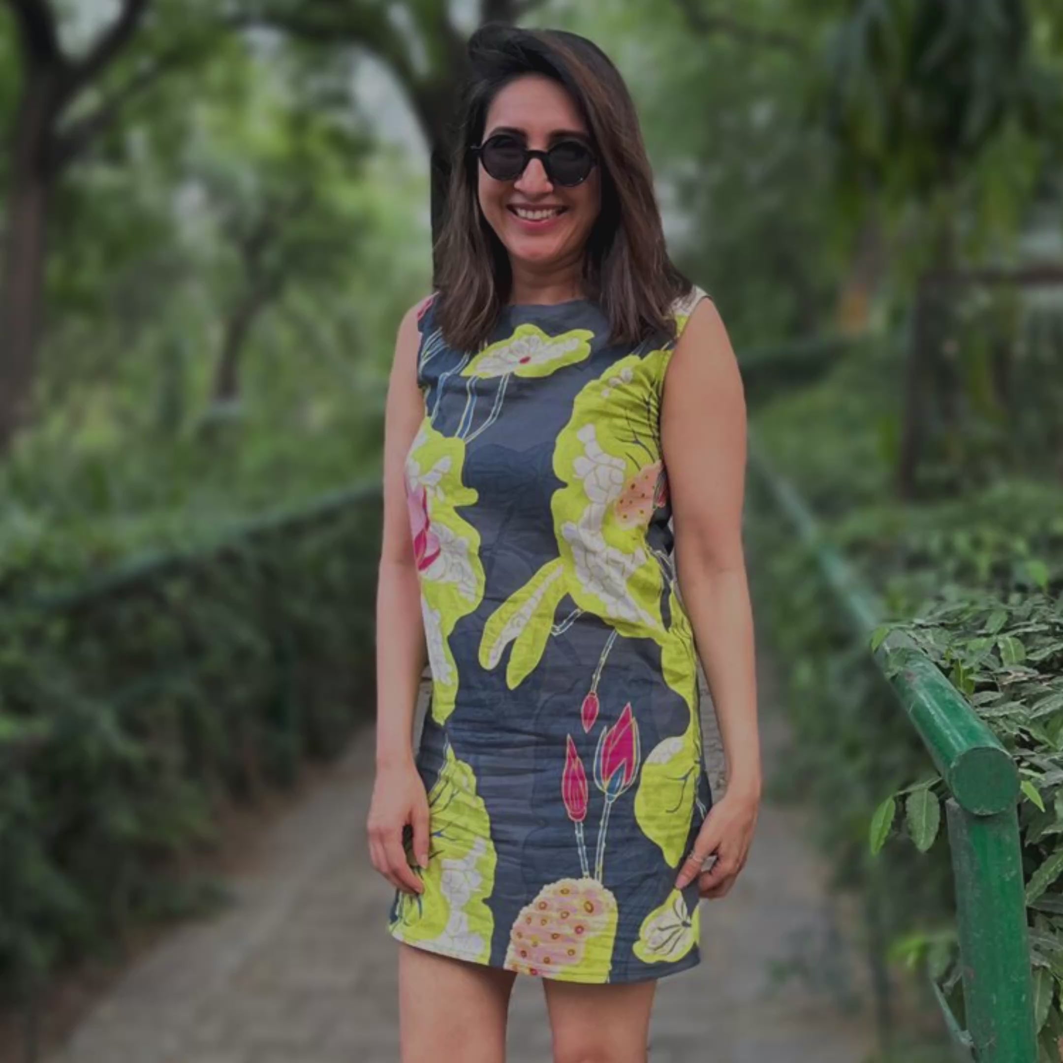 A crisp A-line mini crafted in pure cotton and screen printed with oversized lotus motifs in lime, pink, and white over a navy base. Designed with a boat neckline, clean sleeveless cut, and a concealed back zip, this dress offers a structured yet easy silhouette. Side pockets add functionality, while the subtle flare makes it ideal for all-day wear.